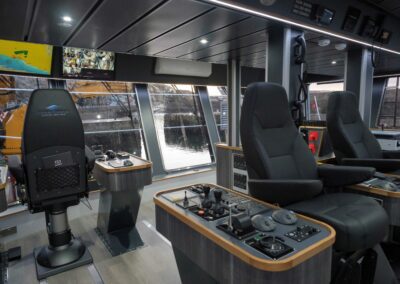 The wheelhouse is arranged with all round visibility including full height windows aft to provide excellent visibility of the aft working deck. The wheelhouse has a main forward command position and an auxiliary station aft. There is also a communal area to port with small pantry area. Below the wheelhouse is a large area dedicated to electronics and accommodation ventilation.